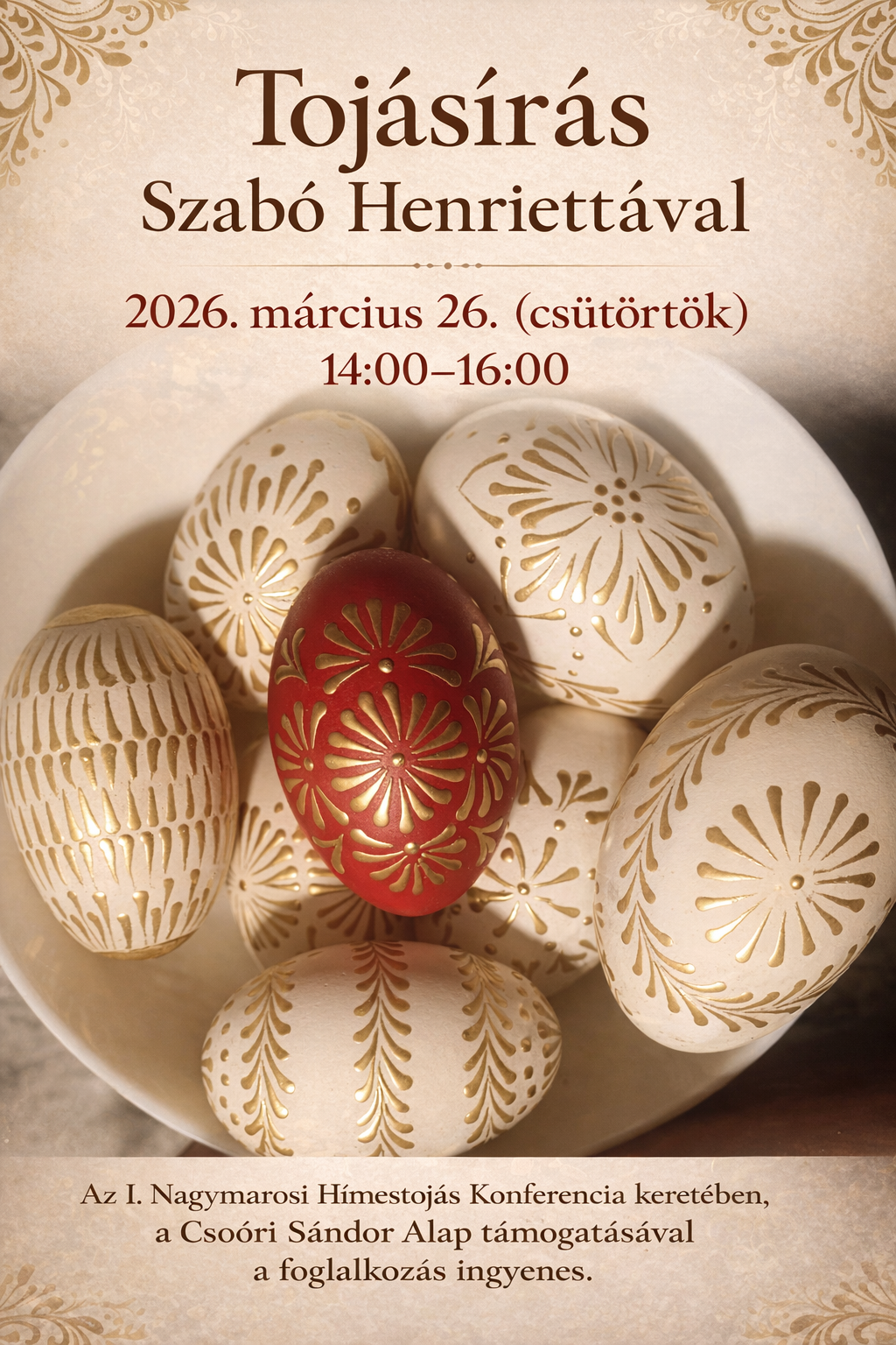 Tojásírás Szabó Henriettával Kezdőlap / Programajánló / Dátum 2026. március 26. Idő 14:00 - 16:00 Művelődési Ház Nagymaros. Fő tér 14.
